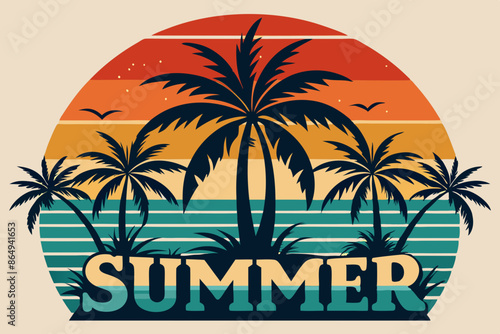© Trendy CraftSVG , Naklejka premium Summer t-shirt design. Retro and vintage summer vibes t-shirt design with palm tree, sea beach, and sunset vector illustration