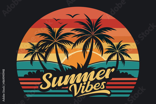 © Trendy CraftSVG , Naklejka premium Summer t-shirt design. Retro and vintage summer vibes t-shirt design with palm tree, sea beach, and sunset vector illustration