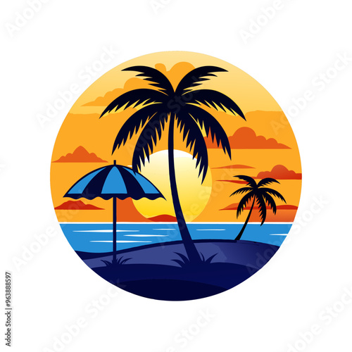© Zahid, Naklejka premium Summer t-shirt design with palm tree vector illustration. Beach t-shirt Design. Vintage Summer Palm Beach Minimalist Illustration