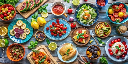 Fototapeta premium Summer table featuring a variety of fresh and colorful dishes, summer, table,...