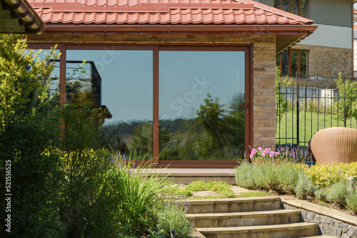 Naklejka premium Summer terrace of a modern country house. Large glass windows reflecting a cozy garden.