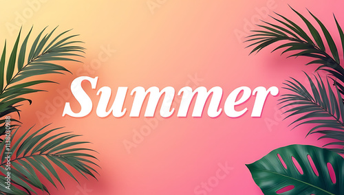 Naklejka premium Summer text features a tropical leaf design against a vibrant color...