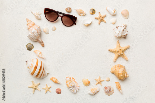 © sosiukin, Obraz premium Summer time concept on colored background. Seashells from ocean shore in the shape of frame separated with space for text top view