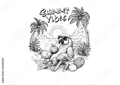 © Fendy, Fototapeta premium Summer time vector flyer, banner template. It's summer time animals line art illustration theme. dog, cat, touchan, flamingo, duck, bear, and tropical and beach theme, animal line art