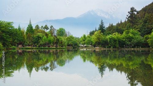 © NguyenNgoc, Fototapeta premium Summer tranquility at Black Dragon Lake Park with serene reflections of trees and mountains
