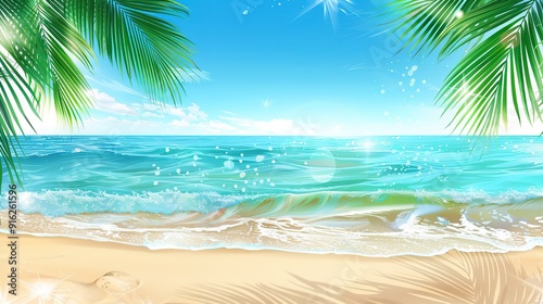 Obraz premium Summer tropical sea with sand beach, palm leaves, sparkling waves and blue sunny sky. Wide template background with copy space