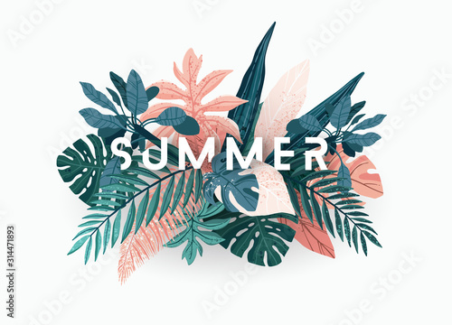 © Ms.Moloko, Fototapeta premium Summer tropical vector design for banner or flyer with exotic palm leaves, monstera and 3d typography.