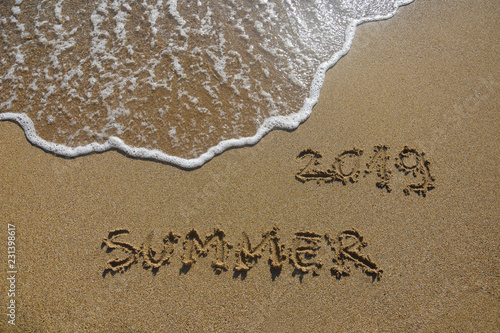 © Ivan, Fototapeta premium Summer vacation concept. Summer 2019 written on wet sand at the beach
