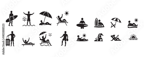 Naklejka premium Summer Vacation Silhouettes and Beach Activity Icons in Minimalist Vector Style, Art & Illustration