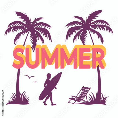 Naklejka premium Summer Vacation: Surfer, Palm Trees, Beach Chair, and Ocean View