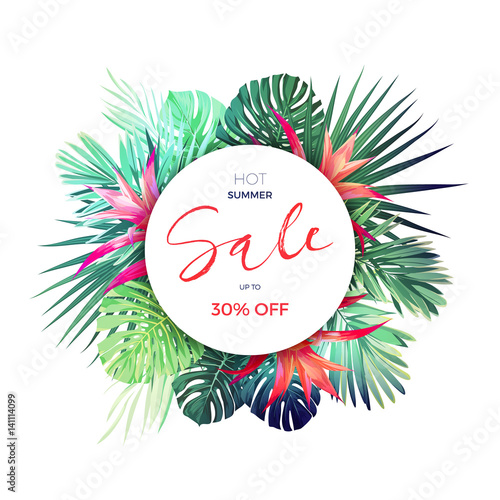 © Ms.Moloko, Obraz premium Summer vector floral sale banner. Tropical template design with palm leaves and red guzmania flowers.