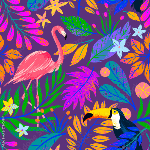 © Xenia Artwork , Naklejka premium Summer vector seamless pattern with hand drawn tropical leaves,flamingo and toucan.Multicolor plants.Exotic background perfect for prints,wrapping paper,t-shirts,textile,background fill,social media.