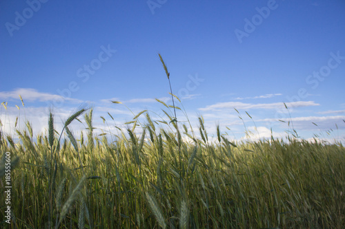 © Larysa, Obraz premium Summer wheat field on blue sky background