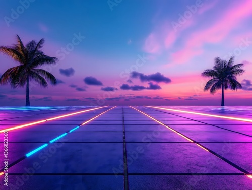 Naklejka premium Summertime, retro, grid: Futuristic cityscape with a glowing grid road leading to a vibrant 80s-style summer horizon.