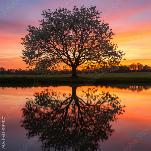 © Вася Пупкин, Fototapeta premium Summertime sunset over a bird cherry tree reflected in water