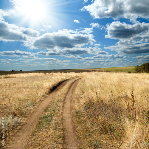 © Mykola Mazuryk, Fototapeta premium sun and clouds over rural road