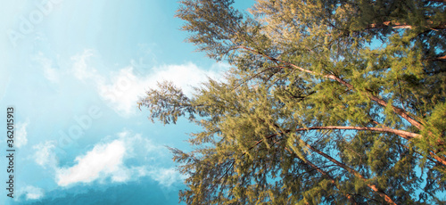© Yanukit, Obraz premium sun beam behind pine tree in summer