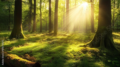 © Wish Craft Arts, Obraz premium Sun beams through the trees in a lush green forest.