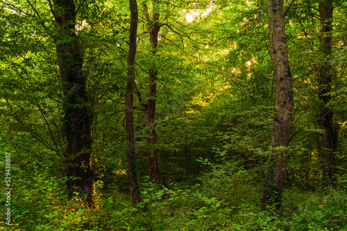 © Vastram, Obraz premium Sun beams through thick trees branches in dense green forest