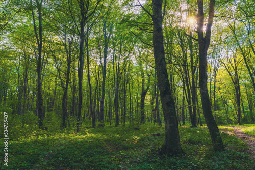 © Vastram, Obraz premium Sun beams through thick trees branches in dense green forest