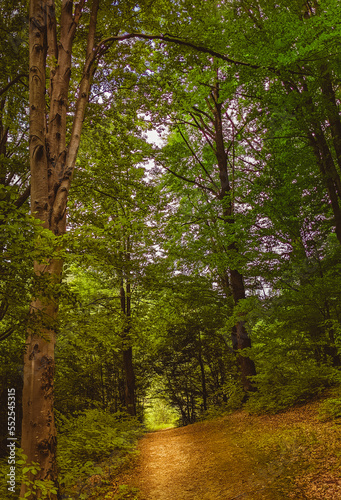 Fototapeta premium Sun beams through thick trees branches in dense green forest
