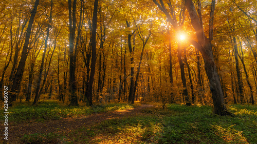 © Vastram, Obraz premium Sun beams through thick trees branches in dense yellow autumn forest