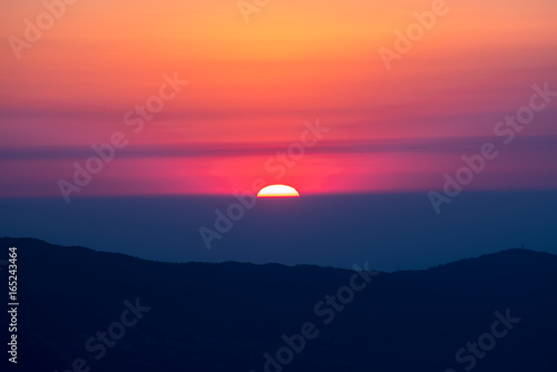 © happystock, Obraz premium sun behind mountain layer during chage of light