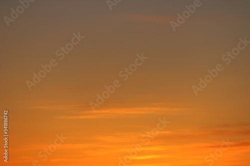 © Stanislav, Fototapeta premium Sun below the horizon and clouds in the fiery dramatic orange sky at sunset or dawn backlit by the sun. Place for text and design.