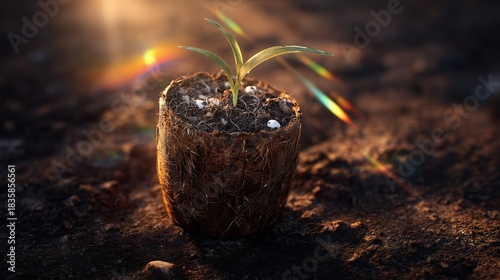 Fototapeta premium Sun-Bleached Biodegradable Coir Seedling Pot Cradling Scorched Tree Plug with Fine Roots in Warm Golden Hour Light