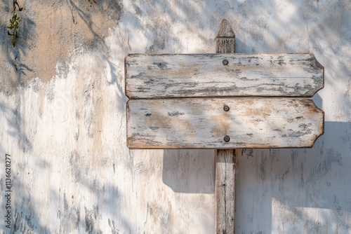 © Artem, Naklejka premium Sun-bleached wooden signage with weathered texture against a rustic wall in a serene outdoor setting