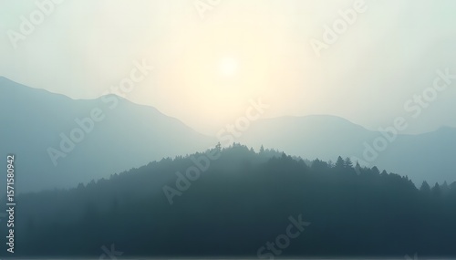 © Marimoon Studio, Fototapeta premium Sun breaking through foggy mountains