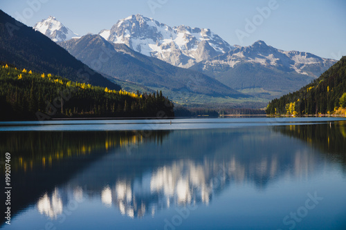 Fototapeta premium Sun catches tips of golden Cottonwood. Birkenhead Lake, BC, Canada.