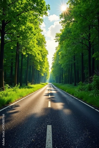 © Busban, Fototapeta premium Sun-dappled asphalt road cuts through lush green forest, scenic clouds , woods, environment, travel