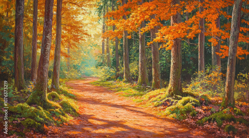 Fototapeta premium Sun-Dappled Autumn Forest Path with Vibrant Orange and Red Foliage
