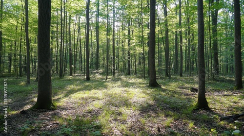 Naklejka premium Sun-Dappled Forest Canopy: Capture the beauty of a sun-drenched forest canopy...