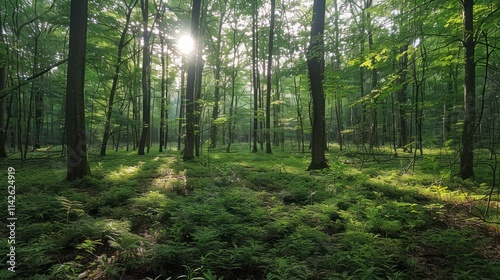 Fototapeta premium Sun-Dappled Forest Floor: A Serene Morning in the Woods