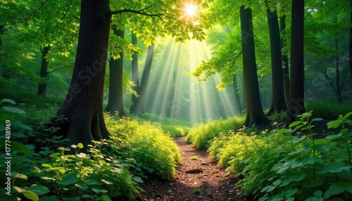 © chaiwat, Obraz premium Sun-dappled forest floor in a pristine wilderness area, lush green canopy overhead, sunlight filtering through leaves, peaceful and serene nature scene , vegetation, wild