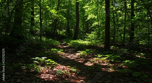 Obraz premium Sun Dappled Forest Path: A Serene Nature Trail in Lush Green Woods