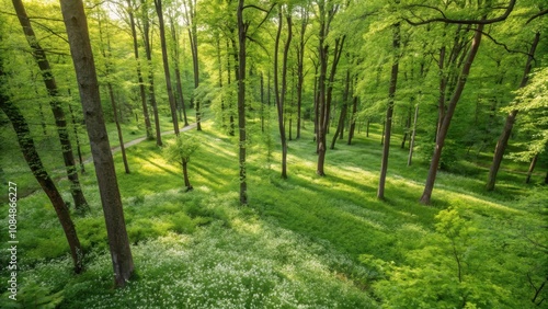 Fototapeta premium Sun-dappled forest path meandering through a verdant landscape of blossoming...