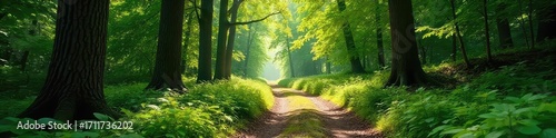 Naklejka premium Sun-dappled forest path winding through ancient trees, lush green foliage,...