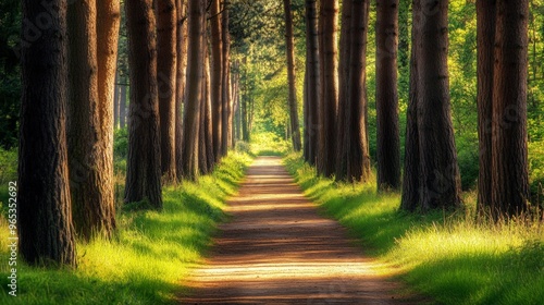 © tanongsak, Obraz premium Sun-dappled forest path with tall trees lining the way