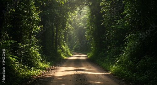 Obraz premium Sun-Dappled Forest Road: A Tranquil Nature Photograph AI Generated