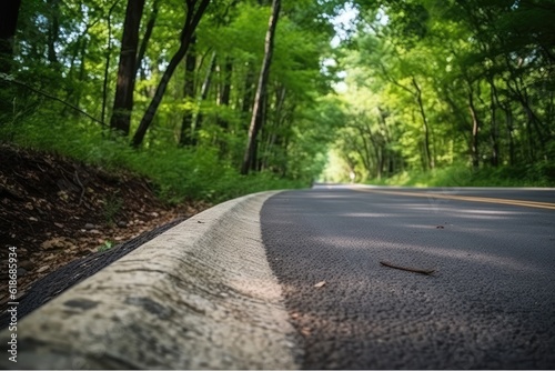 © NikahGeh, Obraz premium Sun-dappled Forest Road: Low Angle View of Curving Asphalt & Concrete Verge