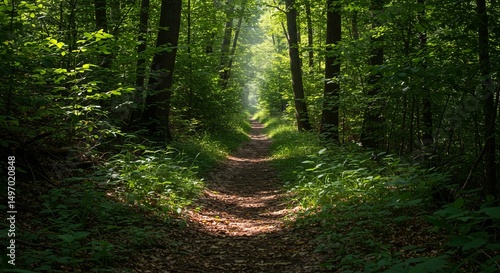 Obraz premium Sun-Dappled Forest Trail Through Lush Green Woods in Early Morning