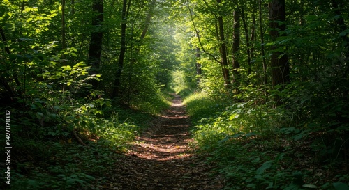 Obraz premium Sun-Dappled Forest Trail Through Lush Green Woods in Early Morning
