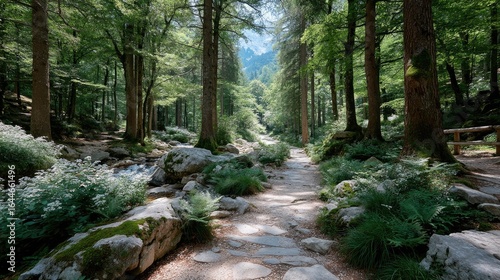 Obraz premium Sun Dappled Forest Trail with Rocks and Lush Greenery