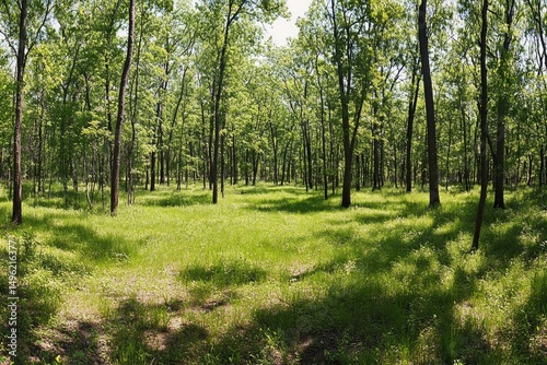 © Sahal, Fototapeta premium Sun Dappled Green Forest Floor With Lush Vegetation