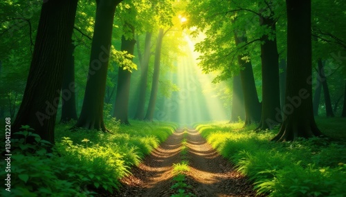 Fototapeta premium Sun-dappled green forest path, dappled light filtering through leaves, summer, image, tranquil