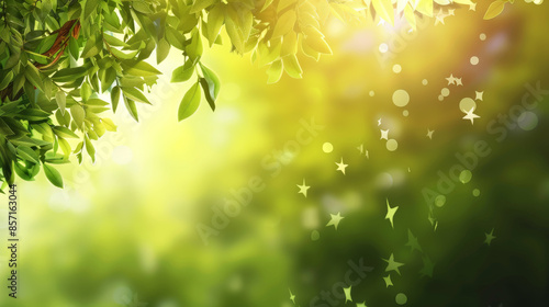 Obraz premium Sun-dappled leafy canopy with magical bokeh of light creating a dreamy, enchanted atmosphere.