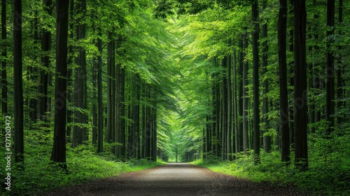 © artzone, Obraz premium Sun Dappled Path Through Lush Green Forest